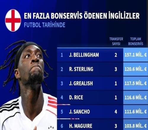 英格兰球员累积转会费排名:贝林厄姆第1,亚伯拉罕7850万第12